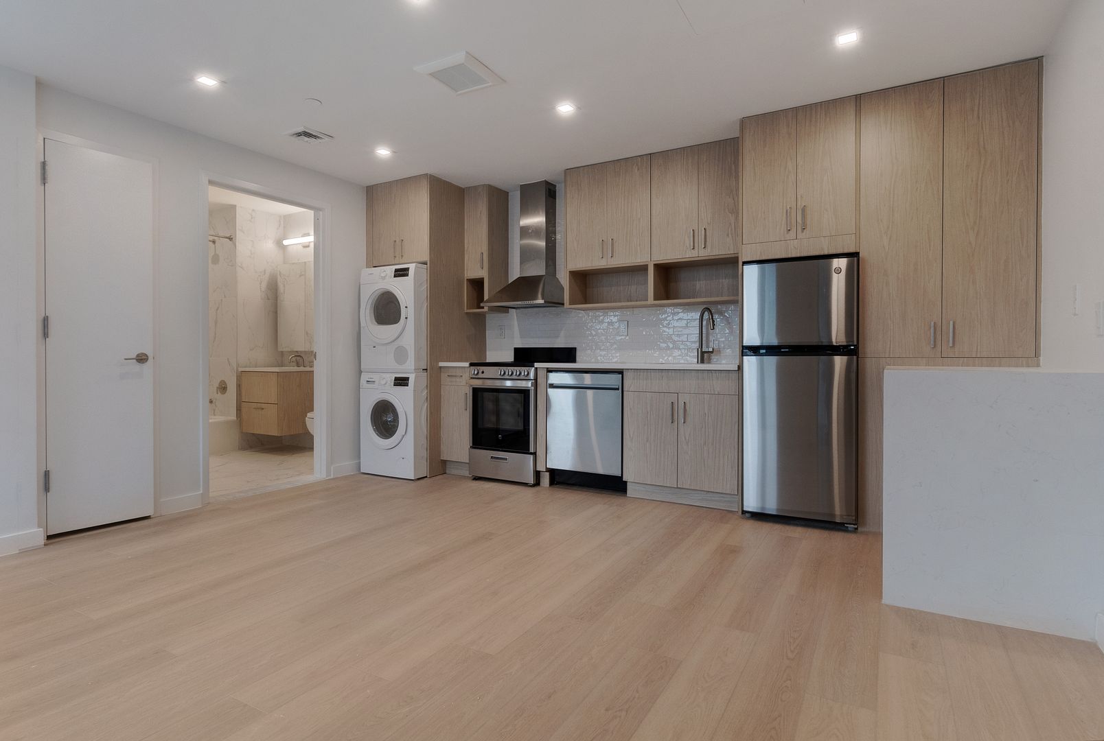 This thoughtfully designed apartment features wide-plank flooring, oversized windows that frame beautiful city views, and an open-concept kitchen complete with sleek stainless steel appliances.