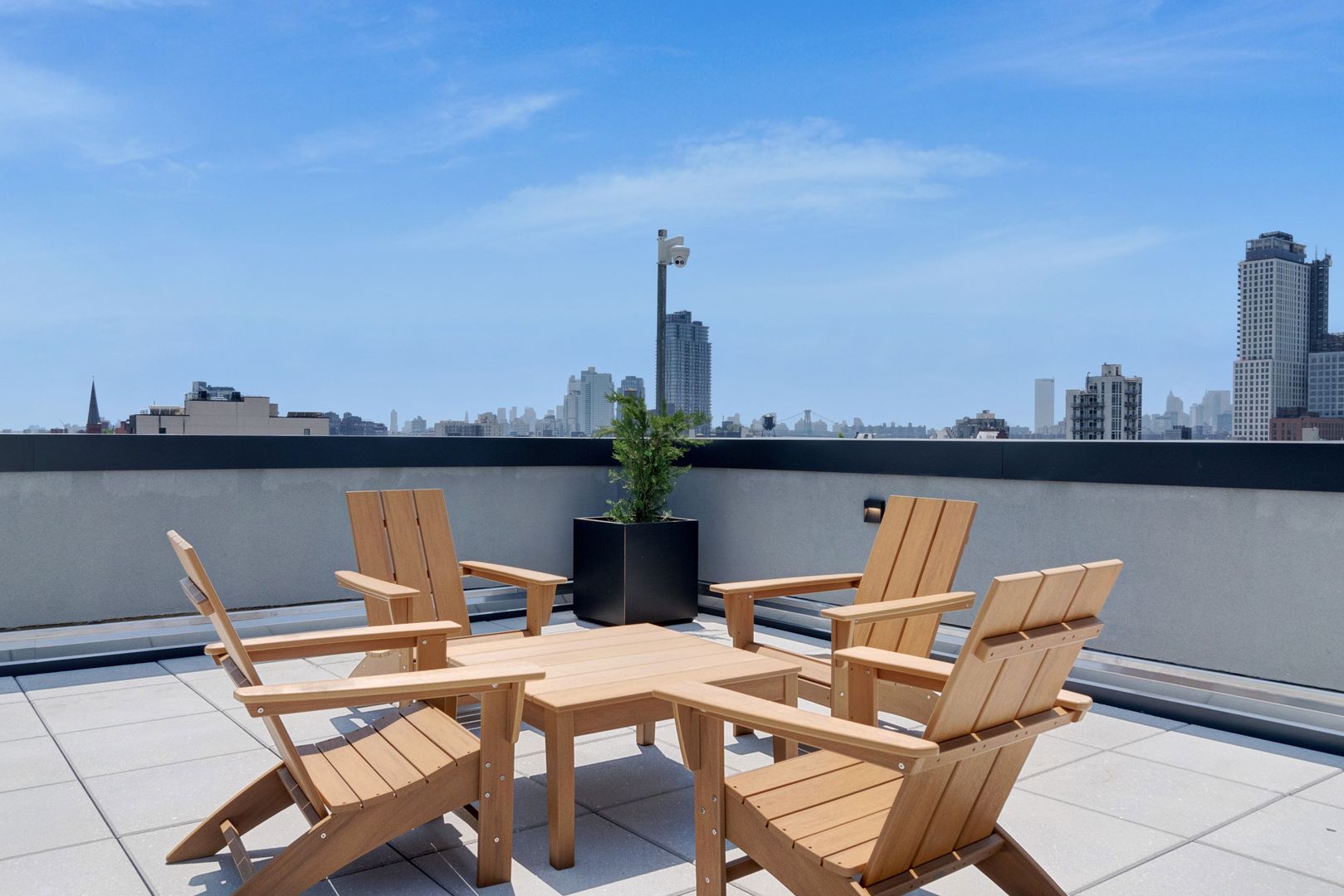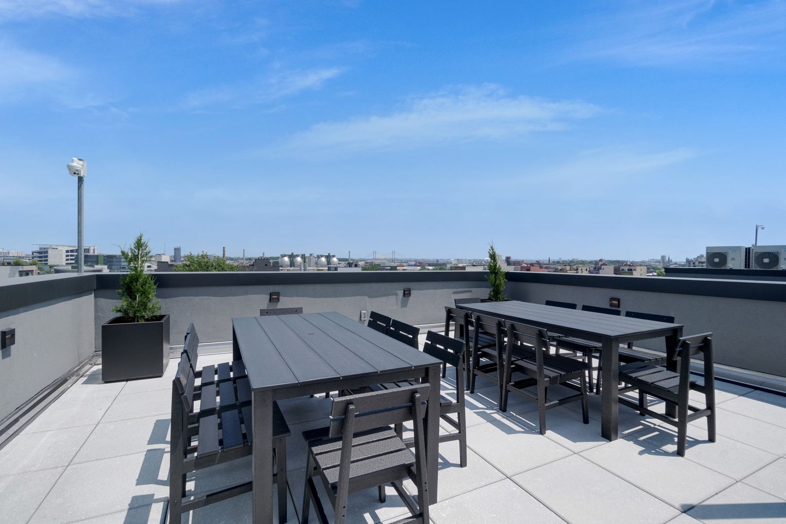 Expansive shared rooftop deck with BBQ grill, lounge and dining areas, and sweeping views of the city skyline and water